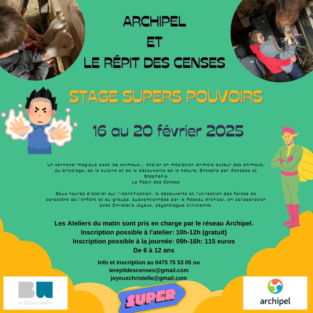 Le stage Supers Pouvoirs, organisé par Le Répit des Censes en collaboration avec le réseau Archipel, s'adresse aux enfants de 6 à 12 ans et propose une expérience riche mêlant médiation animale, développement personnel et activités créatives.