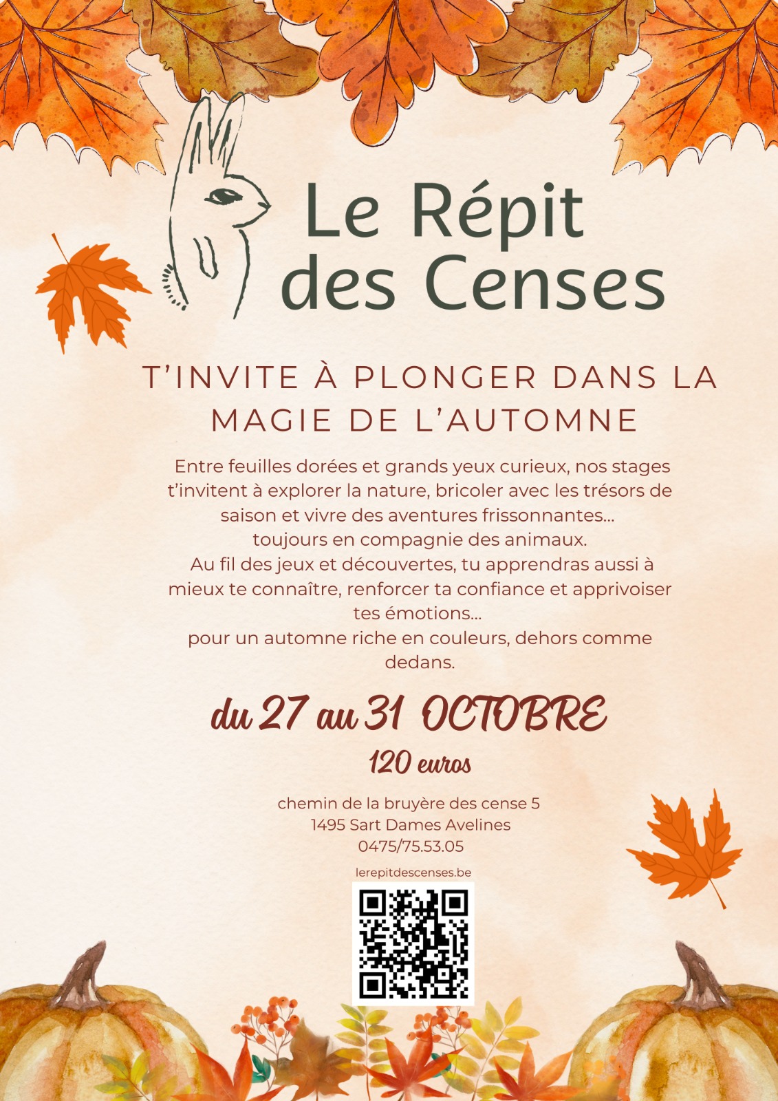 Pendant les vacances d'automne, nos stages offrent aux enfants un moment chaleureux et bienveillant en lien avec les animaux. À travers des activités ludiques, créatives et sensorielles, chaque enfant apprend à exprimer et gérer ses émotions, à renforcer son estime de soi, à développer sa confiance et à respecter et accepter l'autre. Ces moments privilégiés permettent à chacun de grandir à son rythme, dans un cadre inclusif et sécurisant, tout en partageant des expériences joyeuses et enrichissantes avec nos compagnons à poils et à plumes.